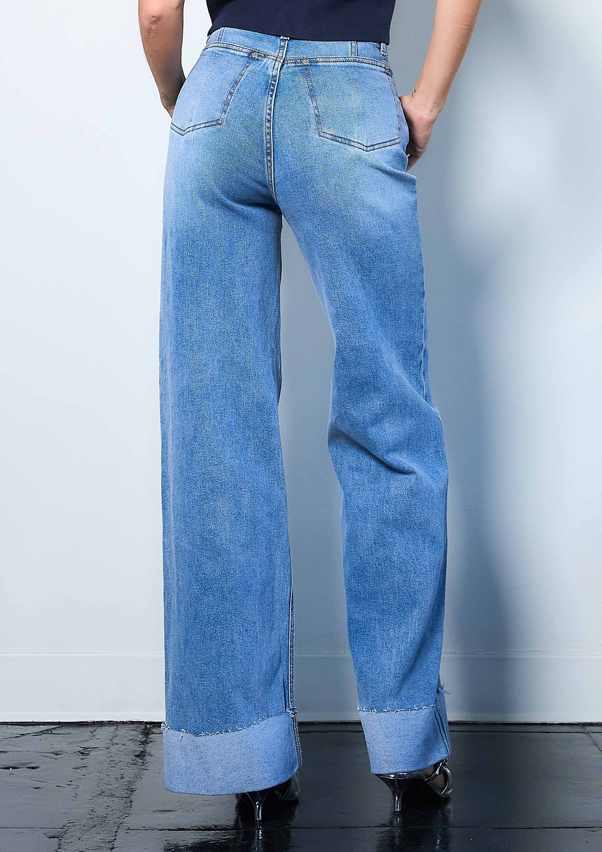 A pair of high-rise wide leg jeans featuring folded raw edge hem, front & back pockets and a zip-fly closure.